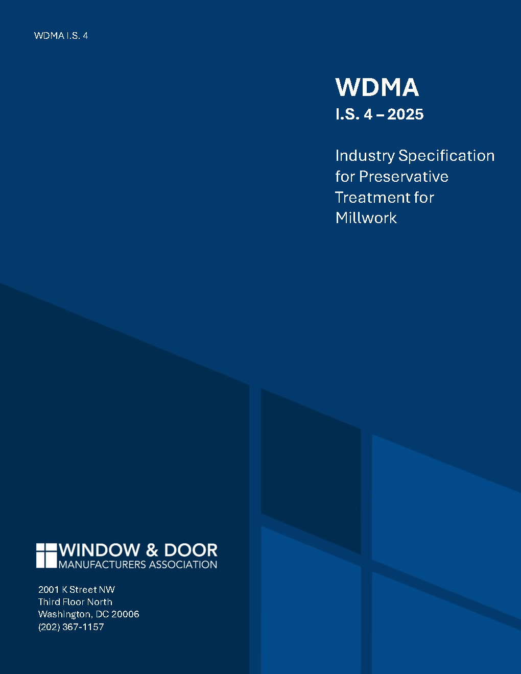 WDMA Store: Window, Entry Door and Skylight StandardsStandardsWDMA I.S. 4-25 Industry Specification for Preservative Treatment for MillworkShow Details![]() WDMA I.S. 4-25 Industry Specification for Preservative Treatment for Millwork provides a nationally recognized standard for the water-repellent preservative treatment for millwork and serves as a basis of common understanding for producers, preservative formulators, distributors and users. The Standard is also intended to promote fair competition within the industry and to aid purchasers and users in obtaining properly treated millwork. This latest edition contains additional requirements for formulation product approval. Once purchased, you will receive an electronic version of the document. Price: $40.00 PurchaseWDMA I.S. 10-25 Industry Specification for Testing Cellulosic Composite MaterialShow Details![]() WDMA I.S. 10-25 Industry Specification for Testing Cellulosic Composite Materials for Use in Fenestration Products applies to composite materials that will be used in the manufacture of fenestration products. It provides a common test basis for composite materials used in the manufacture of fenestration products. Once purchased, you will receive an electronic version of the document. Price: $40.00 PurchaseWDMA I.S. 11-25 Analytical Method for Design Pressure Rating of FenestrationShow Details![]() WDMA I.S.11-25 Analytical Method for Design Pressure Rating of Fenestration Products describes analytical methods for obtaining design pressure ("DP") ratings of fenestration products of sizes other than that of a tested specimen or specimens. For purposes of compliance with this document, DP ratings shall be permitted in increments of no less than one psf. Once purchased, you will receive an electronic version of the document. Price: $40.00 PurchaseAAMA/WDMA/CSA 101/I.S.2/A440-22 North American Fenestration Standard (10/23 Revision) Show Details![]() The 2022 edition of AAMA/WDMA/CSA 101/I.S.2/A440, North American Fenestration Standard/Specification for windows, doors, and skylights (NAFS) is the fourth edition of the standard, and supersedes the previous edition published in 2017 under the same title. This standard is jointly published by the Fenestration & Glazing Industry Alliance (FGIA/AAMA), the Window & Door Manufacturers Association (WDMA), and the Canadian Standards Association (CSA). This Standard/Specification is applicable for use in testing and rating windows, doors, secondary storm products (SSPs), tubular daylighting devices (TDDs), roof windows, and unit skylights, and represents the continuing development of an internationally accepted performance Standard/Specification for all windows, doors, SSPs, TDDs, roof windows, and unit skylights. Note: This is the October 2023 revision. NAFS-22 has been published with two different covers, one for the U.S. market and one for the Canadian market. The requirements and clause numbering are identical in both documents. WDMA only sells the U.S. cover. Once purchased, you will receive an electronic version of the document. Price: $80.00 PurchaseAAMA/WDMA/CSA 101/I.S.2/A440-17 North American Fenestration StandardShow Details![]() The 2017 edition of AAMA/WDMA/CSA 101/I.S.2/A440, NAFS — North American Fenestration Standard/Specification for windows, doors, and skylights is the third edition of the standard, and supersedes the previous edition published in 2011 under the same title. This standard is jointly published by the American Architectural Manufacturers Association (AAMA), the Window and Door Manufacturers Association (WDMA), and the Canadian Standards Association (CSA). This Standard/Specification is applicable for use in testing and rating windows, doors, secondary storm products (SSPs), tubular daylighting devices (TDDs), roof windows, and unit skylights, and represents the continuing development of an internationally accepted performance Standard/Specification for all windows, doors, SSPs, TDDs, roof windows, and unit skylights. Once purchased, you will receive an electronic version of the document. Price: $80.00 PurchaseAAMA/WDMA/CSA 101/I.S.2/A440-17 NAFS 2017 PrimerShow Details![]() This is the Primer to the AAMA/WDMA/CSA 101/I.S.2/A440, NAFS 2017 — North American Fenestration Standard/Specification for windows, doors, and skylights. Intended for code officials, specifiers, and government agencies, this primer to NAFS-17 provides users with guidance on understanding the standard; an outline of its inception and importance, how the standard is enforced, what products are covered, product testing, and the connection between testing, certification, and labeling. Once purchased, you will receive an electronic version of the document. Price: $0.00 PurchaseAAMA/WDMA/CSA 101/I.S.2/A440-11 North American Fenestration StandardShow Details![]() The 2011 edition of AAMA/WDMA/CSA 101/I.S.2/A440, NAFS — North American Fenestration Standard/Specification for windows, doors, and skylights is the third edition of the standard, and supersedes the previous edition published in 2008 under the same title. This standard is jointly published by the American Architectural Manufacturers Association (AAMA), the Window and Door Manufacturers Association (WDMA), and the Canadian Standards Association (CSA). This Standard/Specification is applicable for use in testing and rating windows, doors, secondary storm products (SSPs), tubular daylighting devices (TDDs), roof windows, and unit skylights, and represents the continuing development of an internationally accepted performance Standard/Specification for all windows, doors, SSPs, TDDs, roof windows, and unit skylights. This edition includes all errata, as of January 2017. Once purchased, you will receive an electronic version of the document. Price: $80.00 PurchaseAAMA/WDMA/CSA 101/I.S.2/A440-11 ErrataShow Details![]() This document identifies the errata to 101/I.S.2/A440-11 officially approved by AAMA, WDMA and CSA in March 2014. This errat